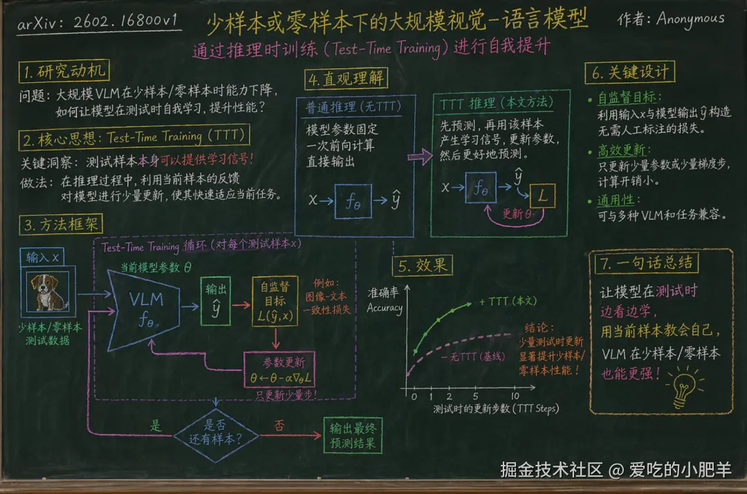 提示词:arxiv.org/abs/2602.16... 把这篇论文转换成教授板书照片的样子:包含图表、箭头、方框和说明文字,从视觉上阐释核心思想。同时笔迹使用多种颜色。文字使用中文。