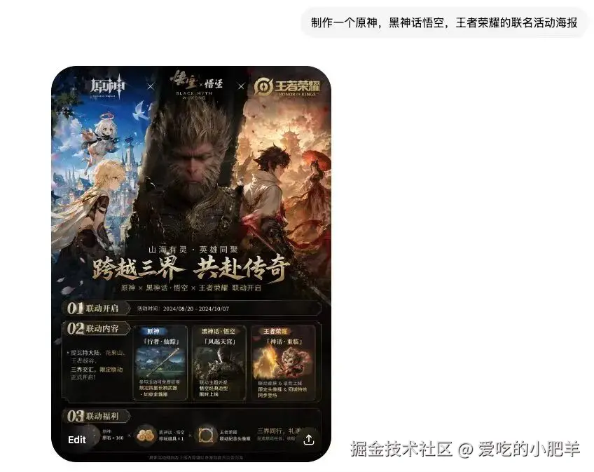 提示词:制作一个原神,黑神话悟空,王者荣耀的联名活动海报
