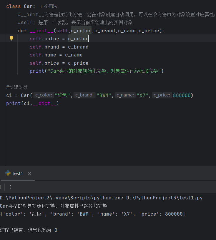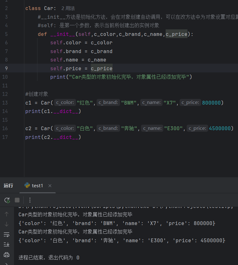 pythonclass Car: def __init__(self,c_color,c_brand,c_name,c_price): self.color = c_color self.brand = c_brand self.name = c_name self.price = c_price print("Car类型的对象初始化完毕,对象属性已经添加完毕") #定义实例方法 def running(self): print(f"{self.brand} {self.name} 正在高速行驶中。。。。") def total_cost(self,discount,rate=0.3): total_cost = self.price * discount+rate * self.price return total_cost #魔法方法 def __str__(self): #输出自定义的方法,返回字符串 return f"{self.color} {self.brand} {self.name} {self.price}" def __eq__(self,other): return self.color == other.color and self.brand == other.brand def __lt__(self, other): return self.price < other.price #测试 c1 = Car("红色","BWM","K1",999999) print(c1) c2 = Car("红色","BWM","K1",999999) print(c2) print(c1 == c2) print(c1 < c2)