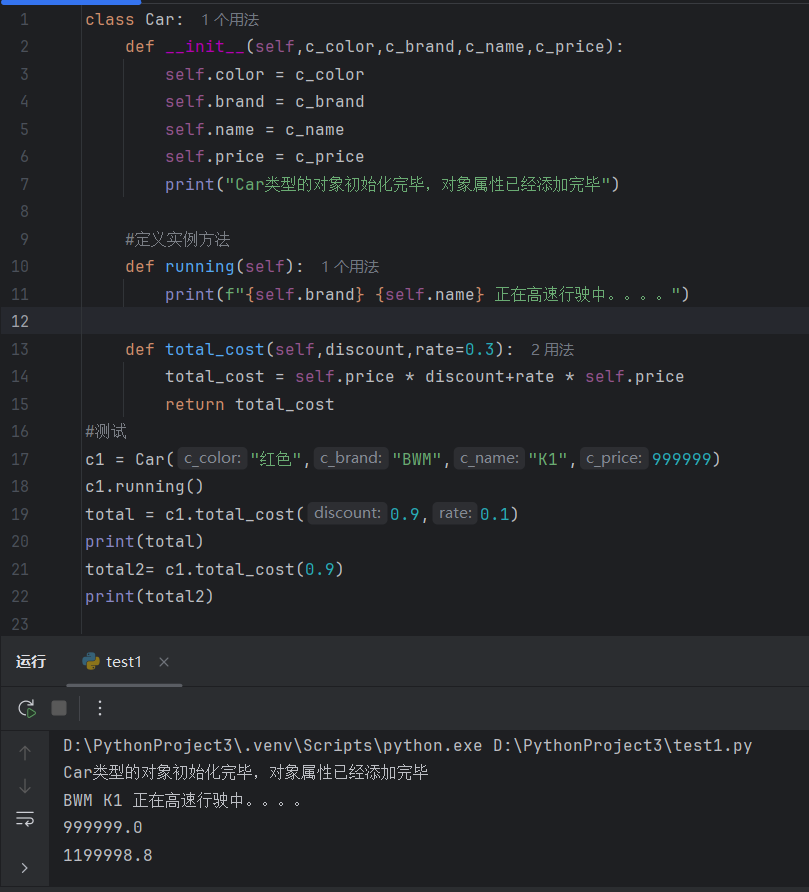 pythonclass Car: #类属性(所有实例对象共享) wheel = 4# 轮胎数量 tax_rate = 0.1 #购置税税率 def __init__(self,c_color,c_brand,c_name,c_price): #实例属性 self.color = c_color self.brand = c_brand self.name = c_name self.price = c_price self.wheel = 2 def running(self): print(f"{self.brand} {self.name} 正在高速行驶中。。。。") def total_cost(self,discount,rate=0.3): total_cost = self.price * discount+rate * self.price return total_cost #测试 c1 = Car("红色","BWM","K1",999999) print(c1.brand) print(c1.wheel) #通过实例对象,查找属性时,会先查找实例属性,实例属性不存在时,再查找类属性 #通过类名访问类属性 print(Car.wheel)