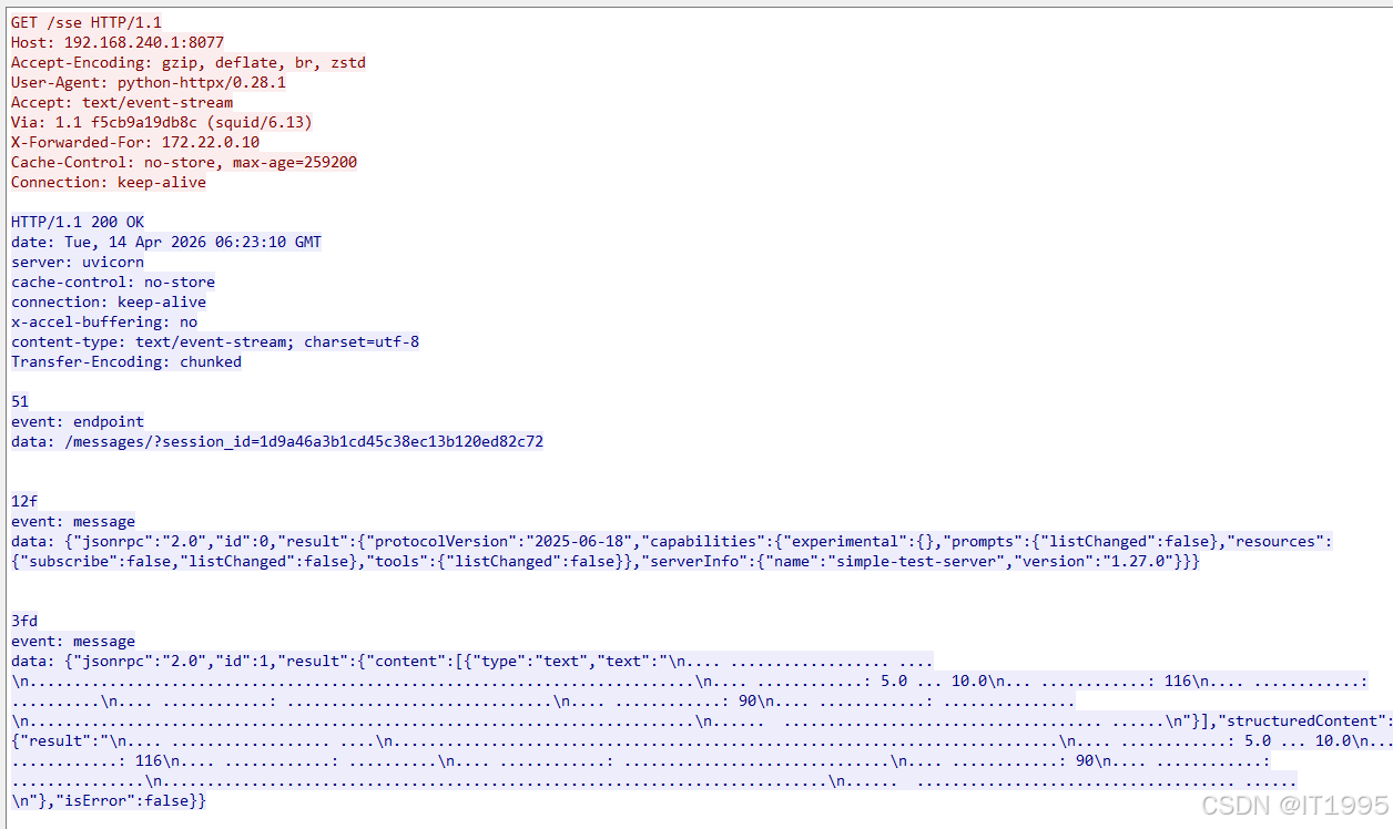 ② 3 个 POST(/messages):是客户端发给服务器的控制指令(比如初始化、确认、调用工具),服务器只会立刻回复 202 Accepted,表示 "指令收到了,结果稍后从 SSE 通道发送"。