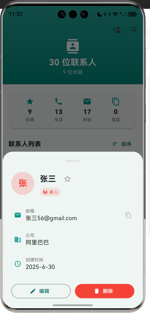 应用采用 Material Design 3 设计规范,以清新青绿为主色调,象征安全与可靠。通过本应用,希望能够帮助用户轻松管理通讯录,让联系人数据始终保持整洁有序。