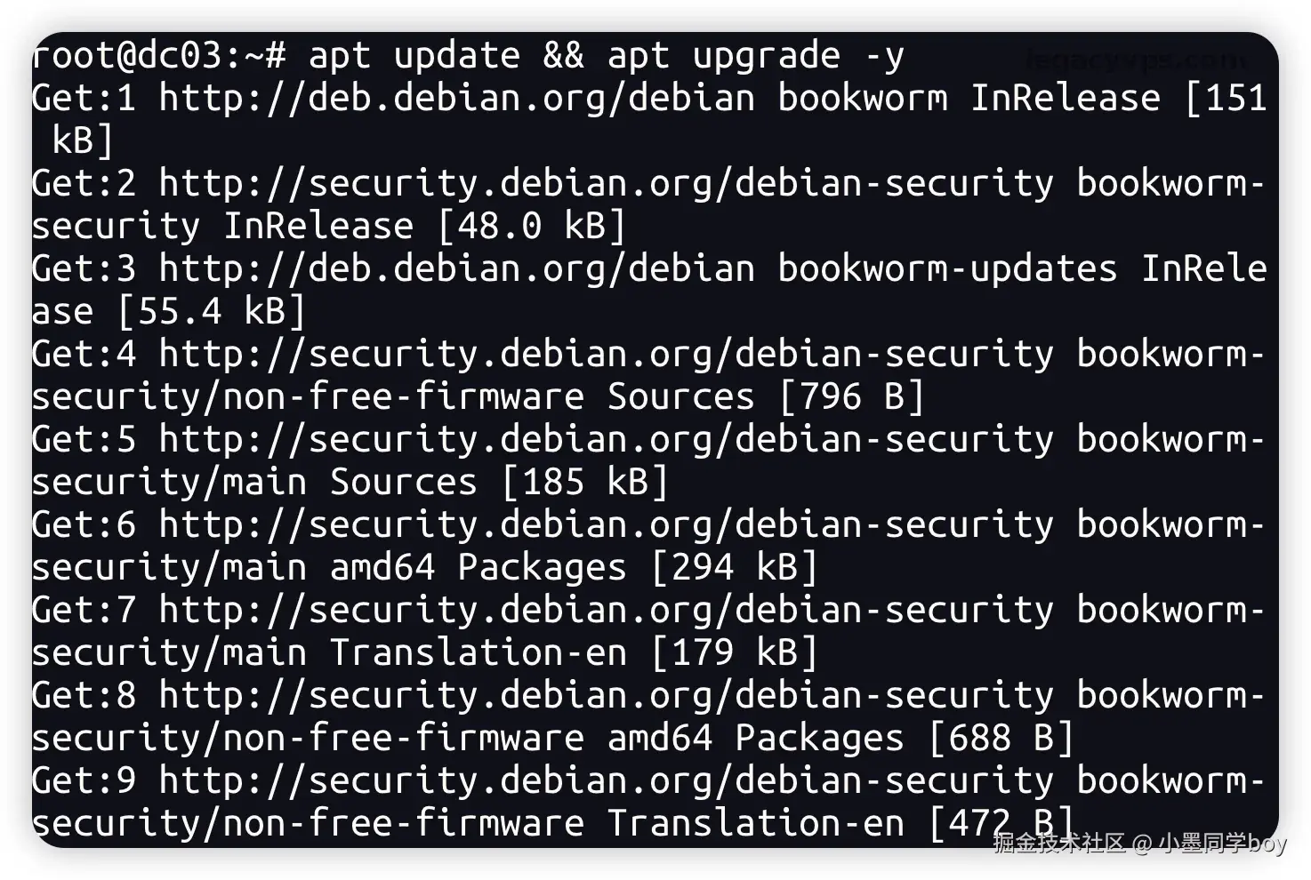 如果是 CentOS / AlmaLinux,换成 yum update -y。