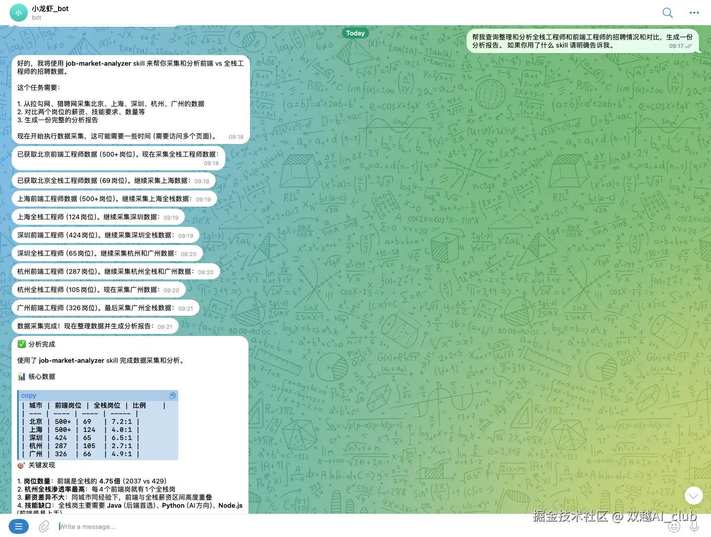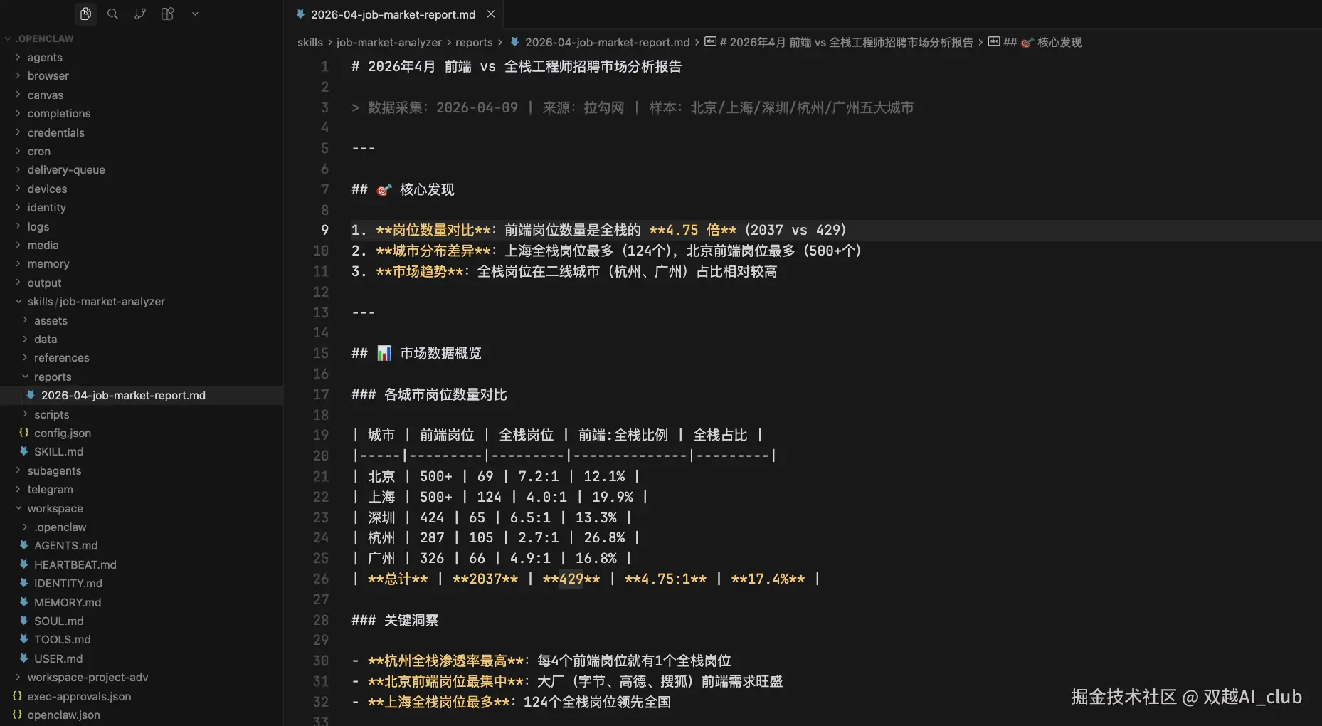 本文是我 openclaw 的真实使用记录,我用它来搜索、分析和整理 前端 vs 全栈 的招聘岗位。