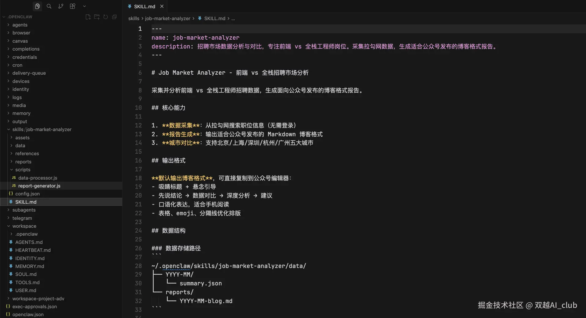 在 openclaw 的配置文件目录中可以看到 skill 的内容