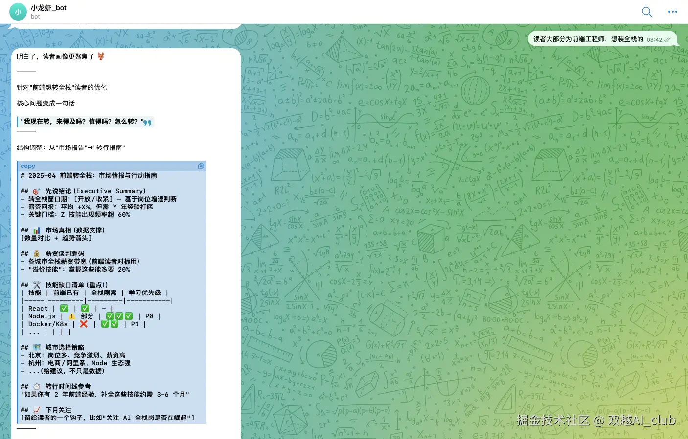AI 根据我的要求,增加了一些优化建议。甚至还思考了前端转全栈的建议。