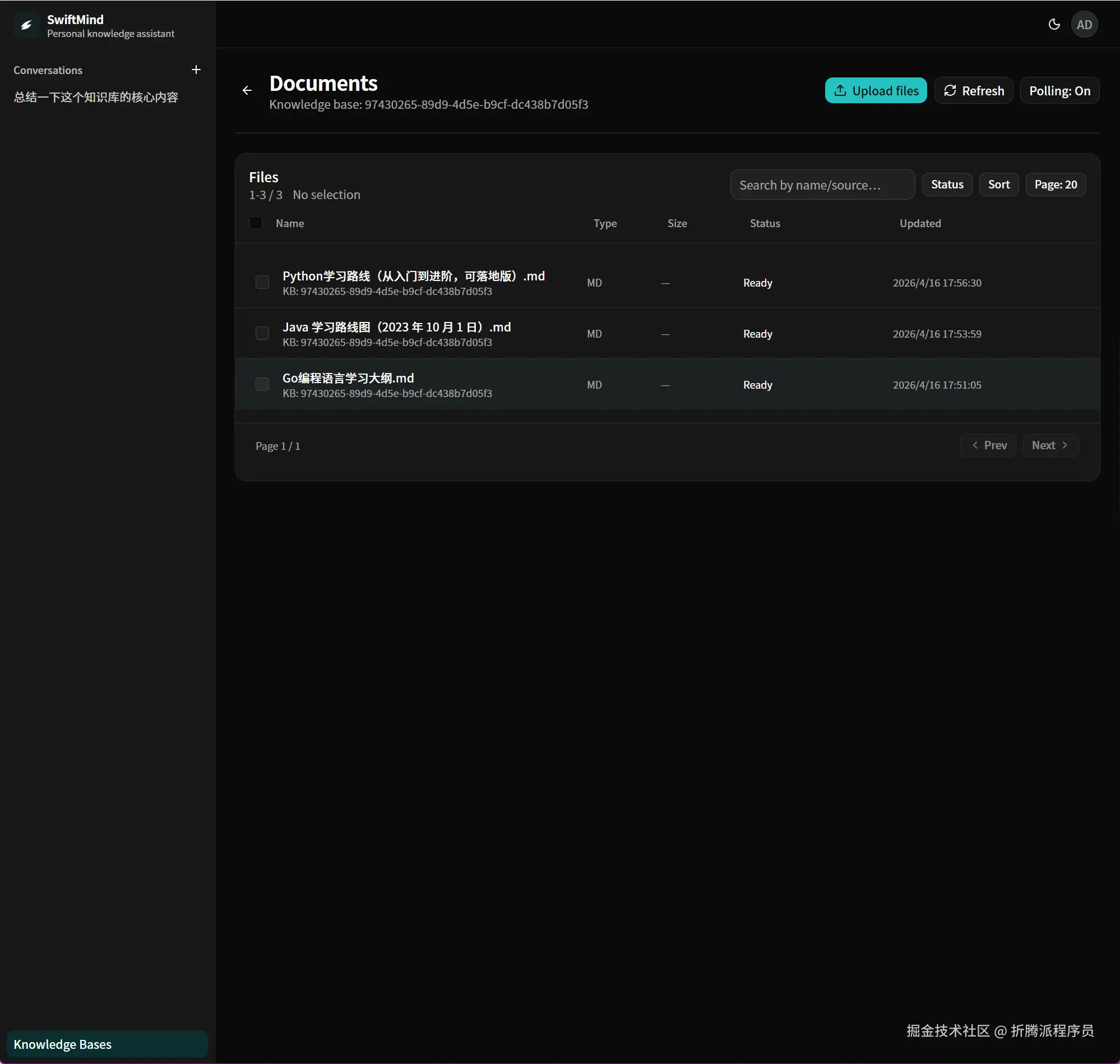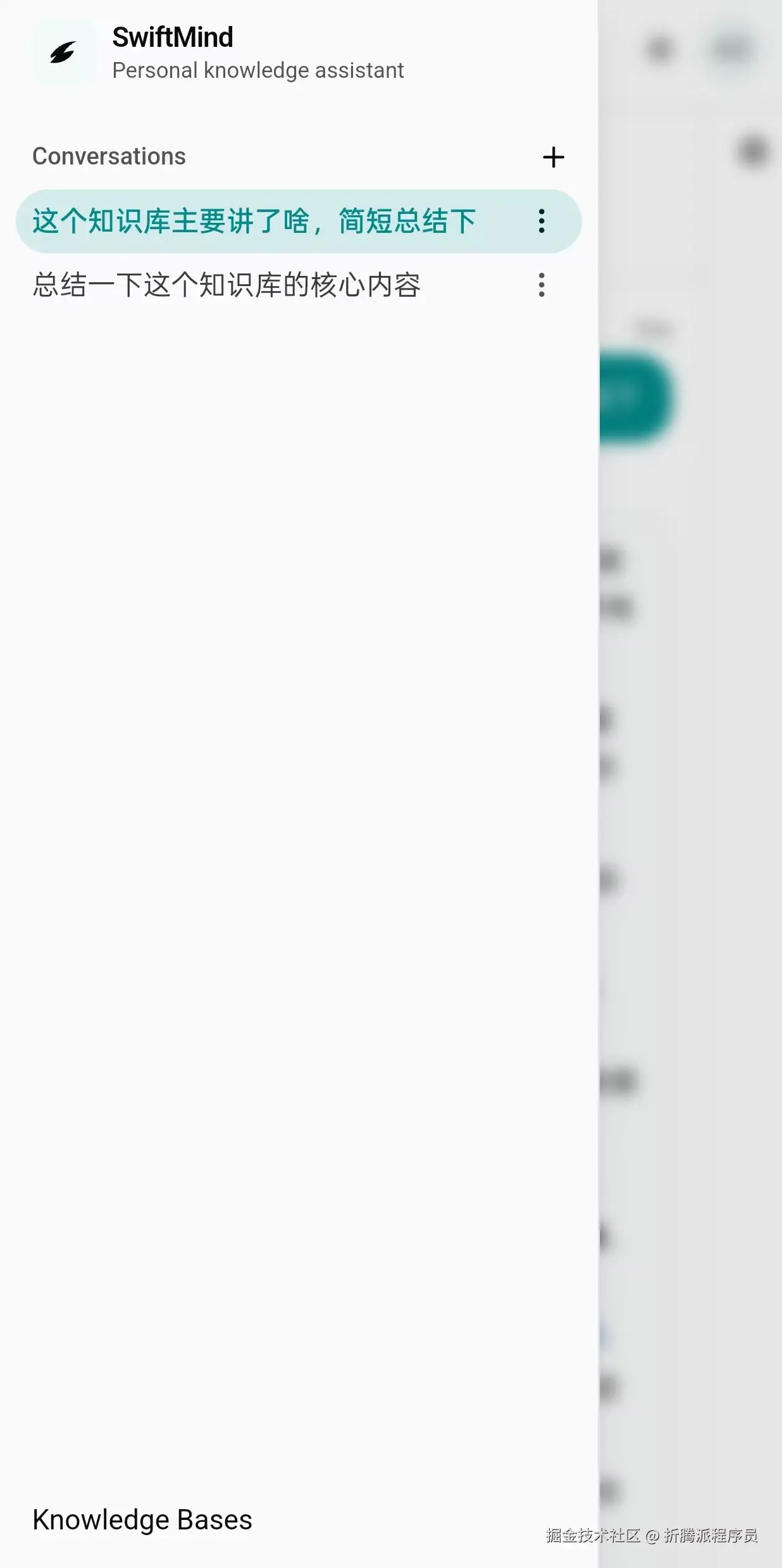 next-themes和 Shadcn UI,我实现了一套极简的视觉切换。暗色模式下,代码块和 Markdown 引用看起来非常护眼。 - 响应式布局:为了让 SwiftMind 在手机上好用,我重新设计了侧边栏,采用了移动端优先的抽屉式导航。现在,随手在手机上上传一张 PDF,AI 就能立刻帮我总结。