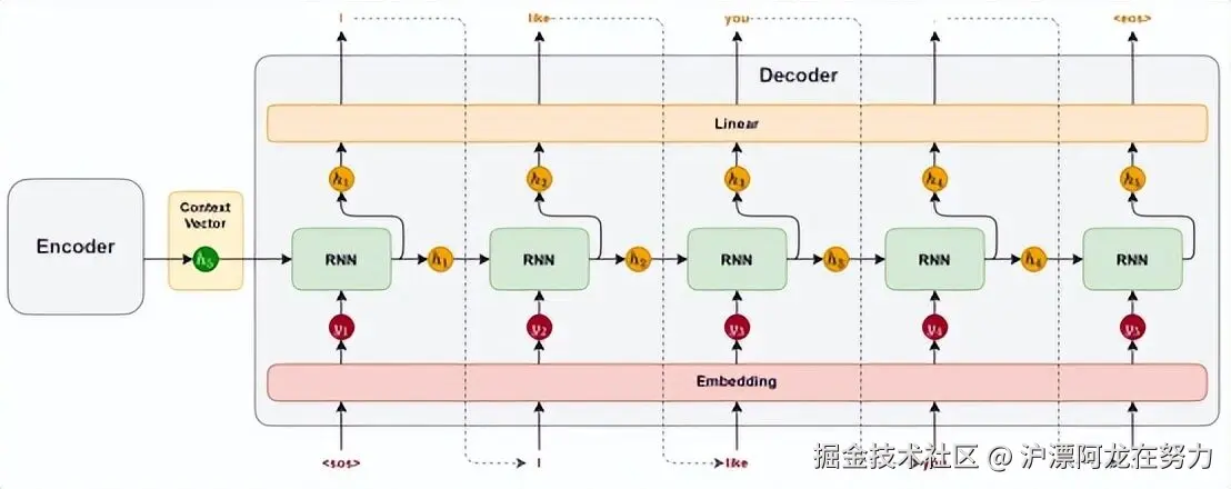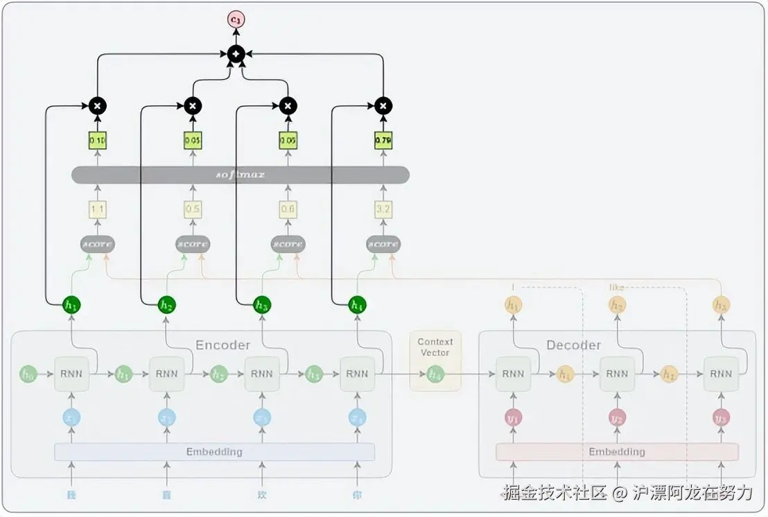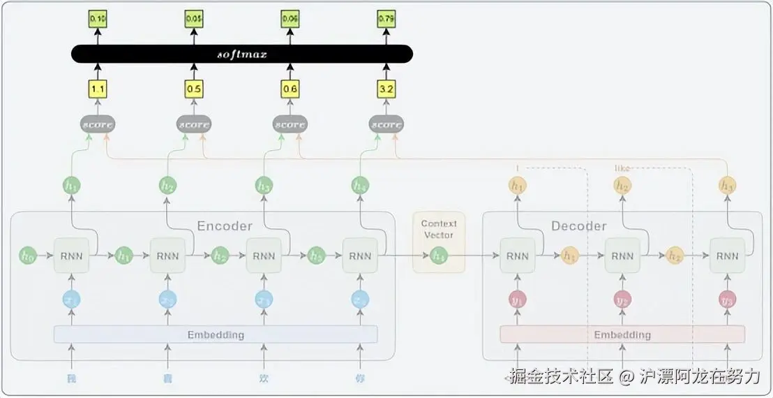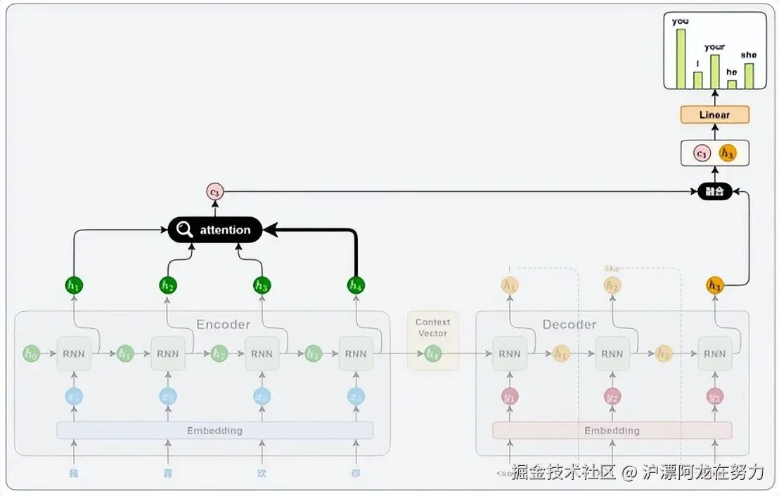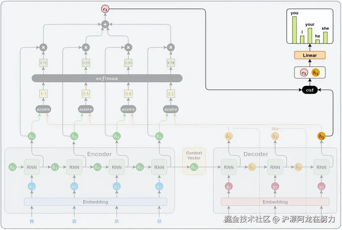 最后一步,解码器把当前步的GRU输出(hdechdec)和上下文向量拼接到一起,组成一个更丰富的信息向量,再通过一个线性层(全连接层)和Softmax,预测下一个词的概率分布。