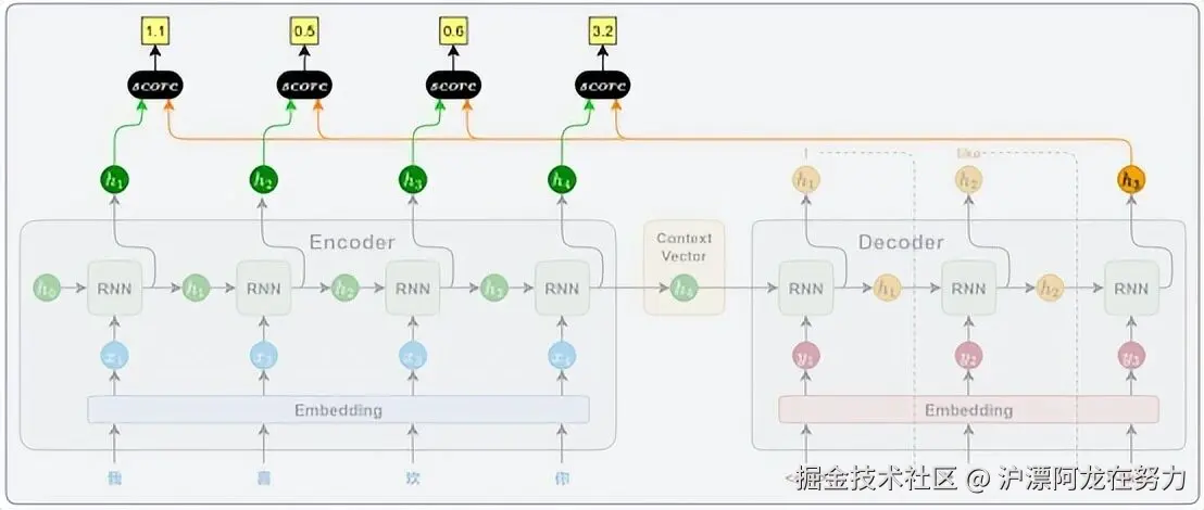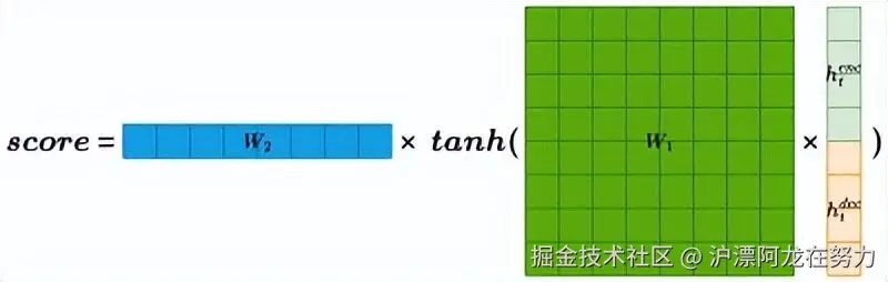 通俗解释 :把解码器状态和编码器状态拼成一个长向量,扔进一个带激活函数的小型神经网络,最后用另一个向量v投影成一个分数。