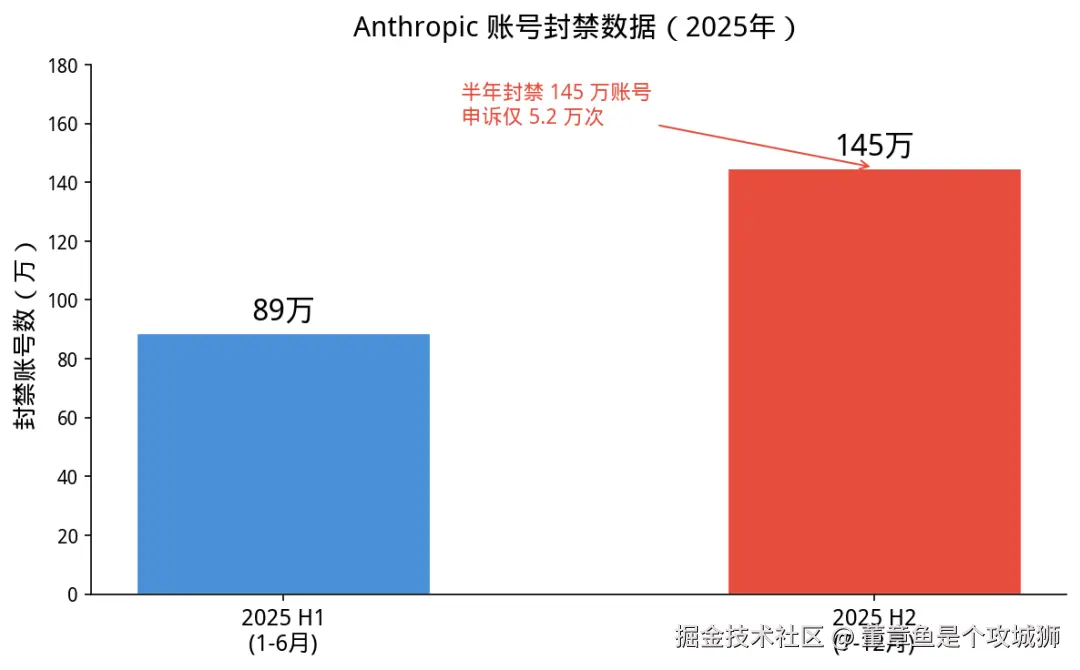 2025 年下半年,Anthropic 封禁了 145 万个账号,同期收到 5.2 万次申诉,仅 1700 次被推翻。