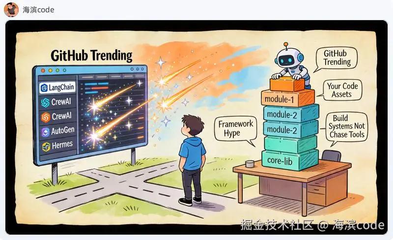 GitHub 上有 9,900 个 ai-agent 仓库。最终活下来不会超过 5 个。而你的精力,应该花在那些不随框架消亡的东西上。