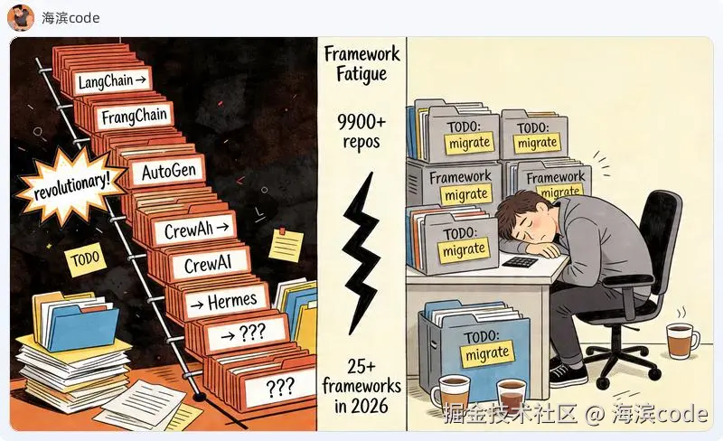 说句实在话,我自己就是过来人。2025 年底到 2026 年初,LangChain → AutoGen → CrewAI → OpenClaw,一个不落。每换一个框架,之前写的适配代码、踩过的配置坑、积累的调试经验就全废了。转头一看,半年过去了,我的实际产出并没有因为"用了更好的框架"而变多。