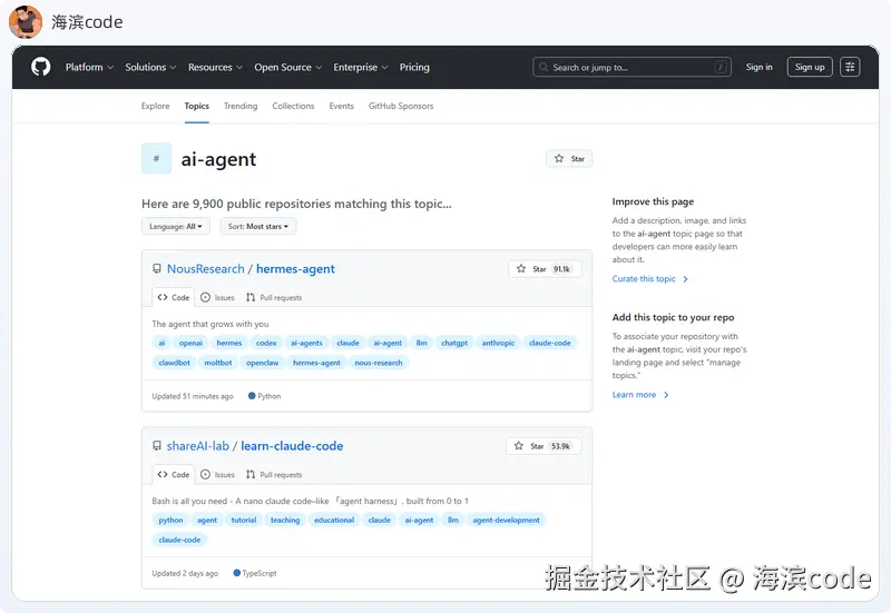 打开 GitHub 的 ai-agent Topic 页面: