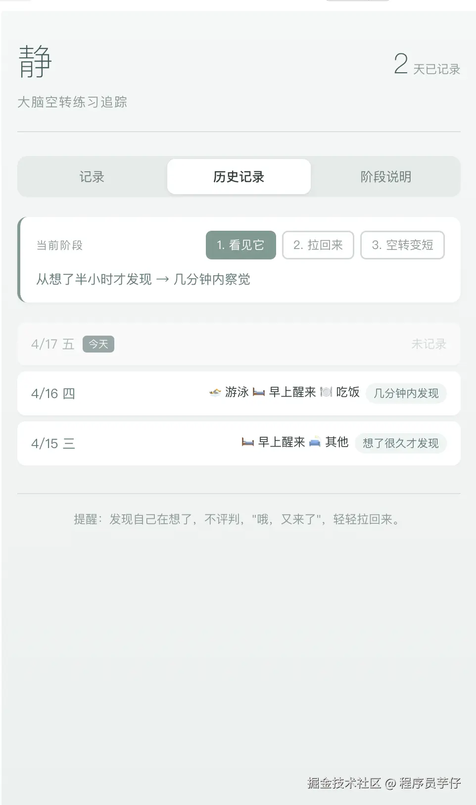 于是我让 Claude 帮我做了一个正念练习追踪器。很简单的一个页面,每天花几秒钟记录:在什么场景想了工作、多快察觉到的、有没有拉回来、当天的感受。数据持久化存储,可以回看历史记录,也能看到自己当前在哪个阶段。