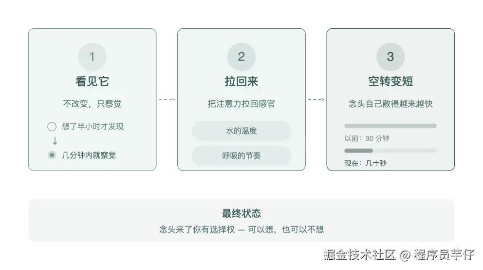 整个过程有一个非常重要的细节:拉回来的时候,对自己的态度要轻。不是"我怎么又想了",而是"哦,又想了"。因为一旦你烦自己"又在想",那个烦本身又是一层新的消耗。