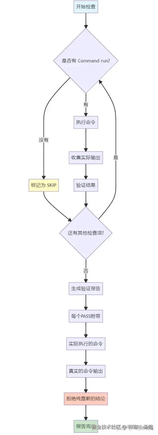 每一项检查必须严格按照这个结构执行。如果没有实际执行的 Command run(命令运行)环节,那就不能算 PASS,只能算跳过。