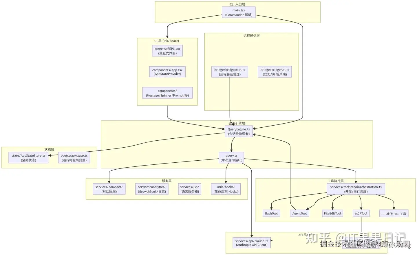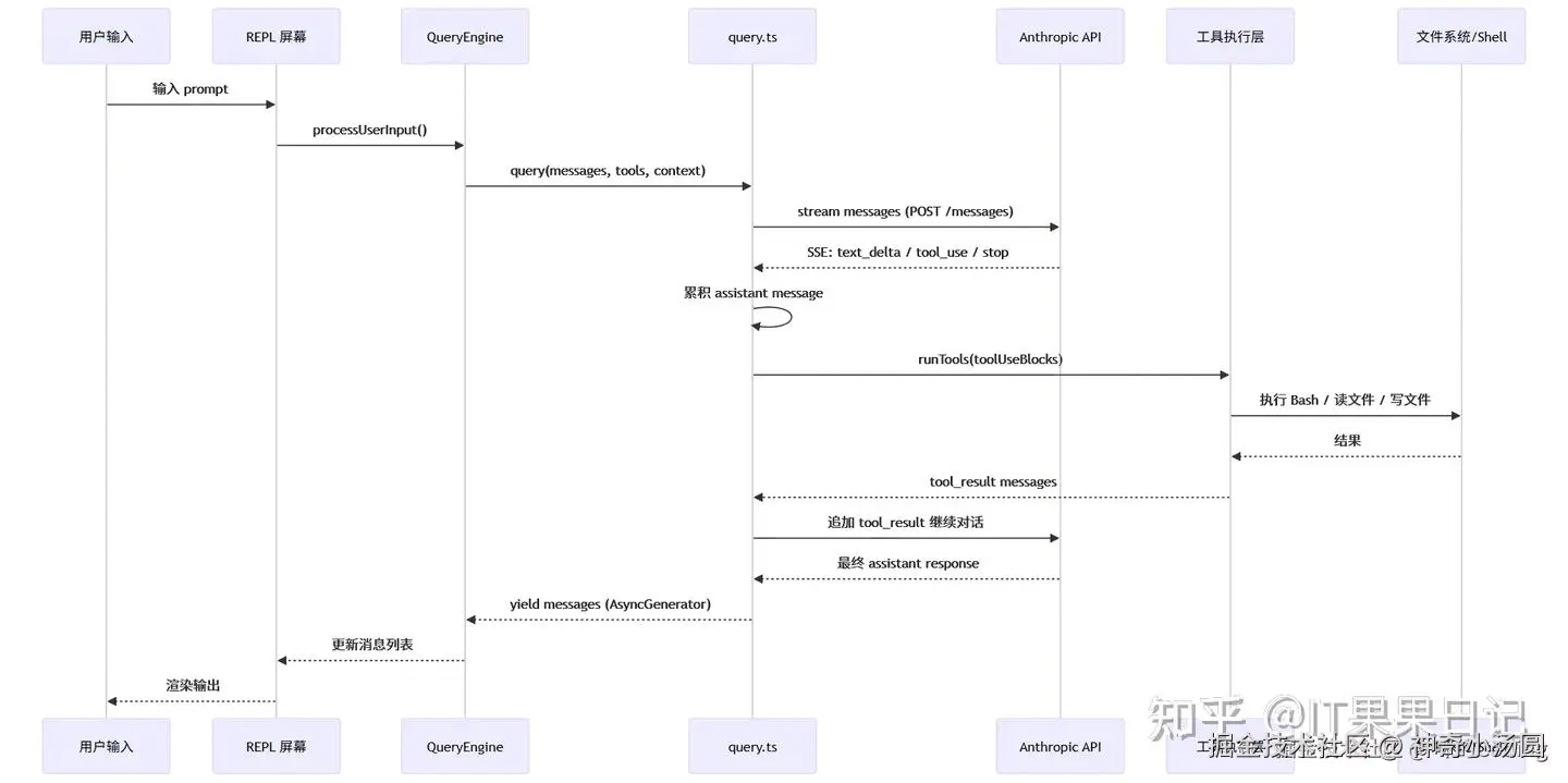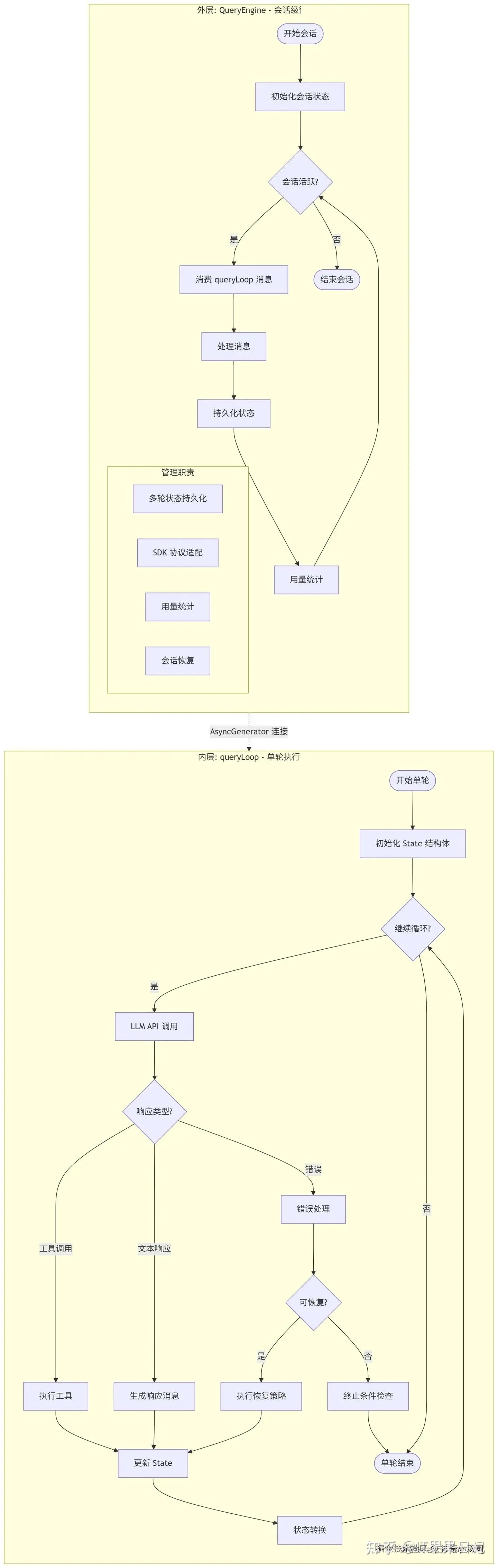 外层:QueryEngine :负责会话级管理,包括多轮状态持久化、SDK 协议适配、用量统计、会话恢复。它是整个会话的协调者,管理整个对话的生命周期。