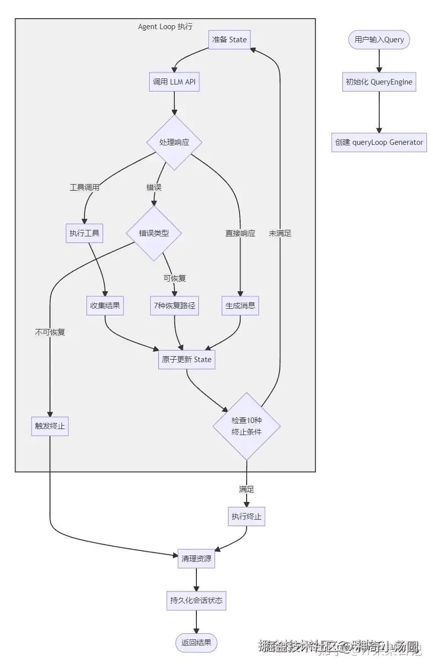 内层:queryLoop :负责单轮执行,包括 API 调用、工具执行、错误恢复。它处理单次的 "思考 - 行动" 循环,每一次迭代就是一次 LLM 调用 + 工具执行。