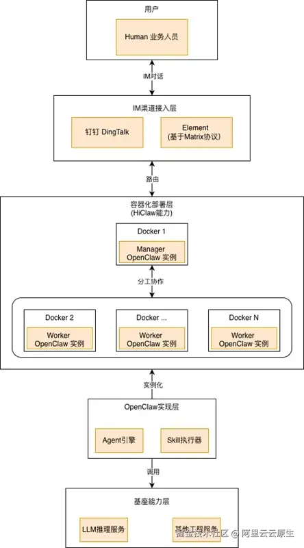 1\] HiClaw [github.com/agentscope-...](https://link.juejin.cn?target=https%3A%2F%2Fgithub.com%2Fagentscope-ai%2FHiClaw%2Fblob%2Fmain%2FREADME.md "https://github.com/agentscope-ai/HiClaw/blob/main/README.md") \[2\] **HiClaw Team 方案** [github.com/agentscope-...](https://link.juejin.cn?target=https%3A%2F%2Fgithub.com%2Fagentscope-ai%2FHiClaw%2Fblob%2F56a894315c8f87513d4bf8adb0a0c77a6a36b11c%2Fdocs%2Fdesign%2Fteam-worker-proposal.md "https://github.com/agentscope-ai/HiClaw/blob/56a894315c8f87513d4bf8adb0a0c77a6a36b11c/docs/design/team-worker-proposal.md")