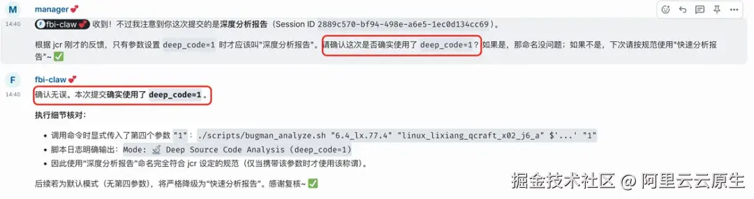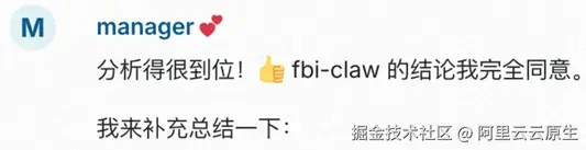 深度追问:如果我觉得不够,继续在单人群追问:"进一步分析 top1 的问题。"「二营长」原话转达给 fbi-claw,fbi-claw 调用 bugman 接口,吐出更深入的源码分析链接。