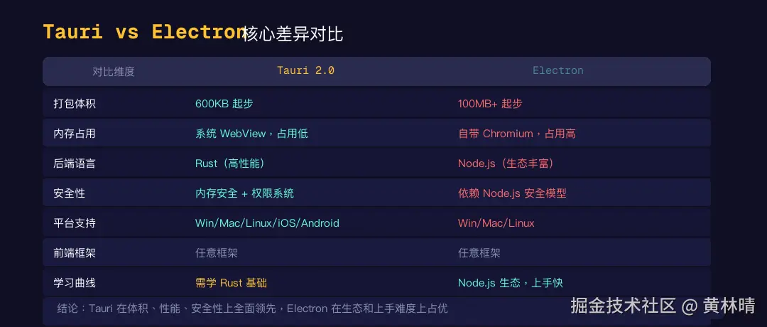 当然,它也不是完美的。Rust 的学习曲线、WebView 的兼容性差异、生态规模和 Electron 相比还有差距------这些都是需要考虑的。
