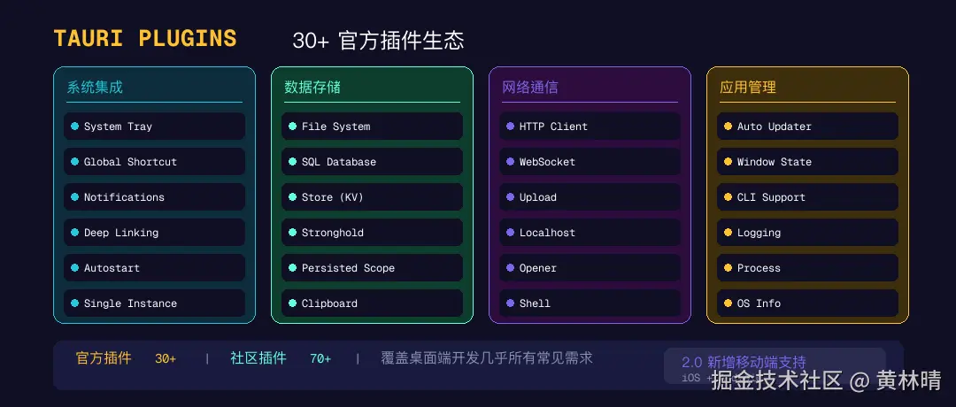 不要从零写 Rust。先用官方插件解决问题。文件读写、HTTP 请求、本地存储、系统通知......这些都有现成的插件,npm install 一下就能用。