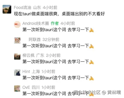 然后好几个人跟着回复:"第一次听到 Tauri 这个词,去学习一下。"