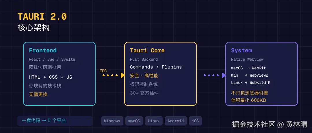 你用熟悉的前端技术(React、Vue、Svelte 随便选)写界面,用 Rust 写后端逻辑,打包出来的应用可以跑在 Windows、macOS、Linux,甚至 Android 和 iOS 上。