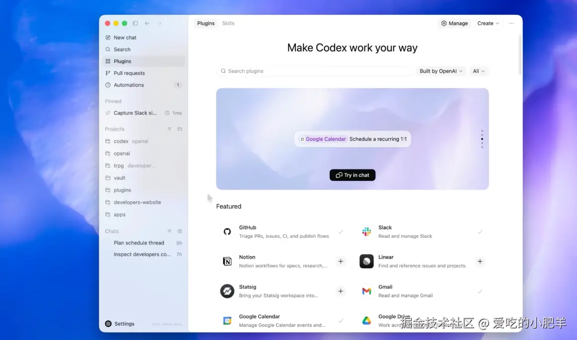 而且插件之间有优先级排序。你让 Codex 做一件跨工具的事,它会从插件库里按排序决定谁先上。