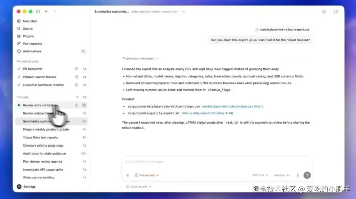 以前的自动化,就是定时跑个脚本。这次有变化:自动化任务可以沿用一个已经跑过一轮的对话线程,把之前的上下文带进去继续。