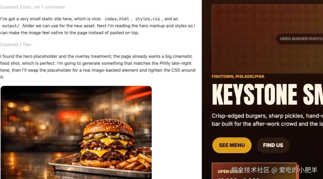 你让它给页面生一张配图,它生完之后不光把图丢给你,还会自动把图塞进项目目录、顺手改 CSS 让样式匹配上。