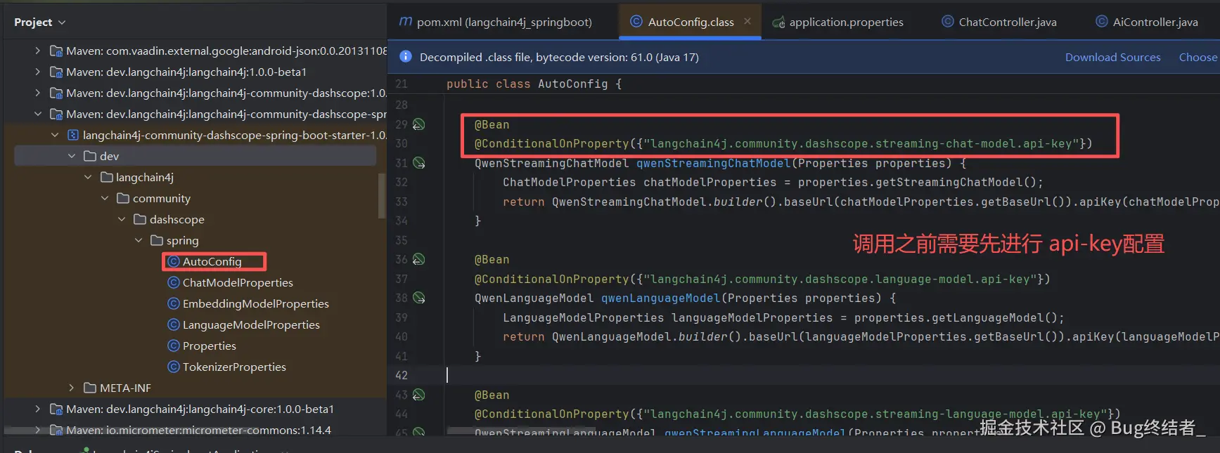 langchain4j.community.dashscope.chat-model.api-key=${apiKey} # 阿里百炼大平台申请apiKey