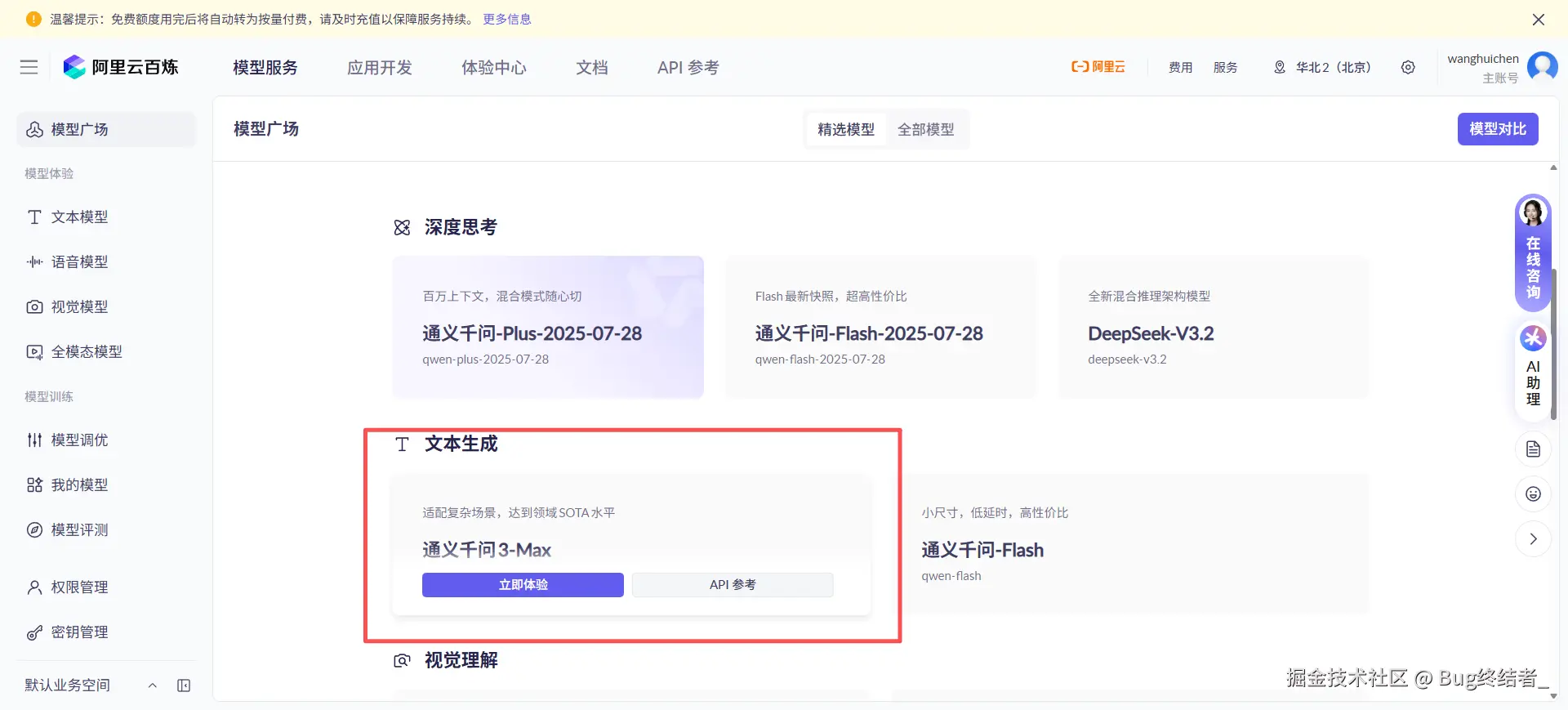 登录阿里云账号,进入模型服务,选择qwen-max模型,点击进入API参考页面