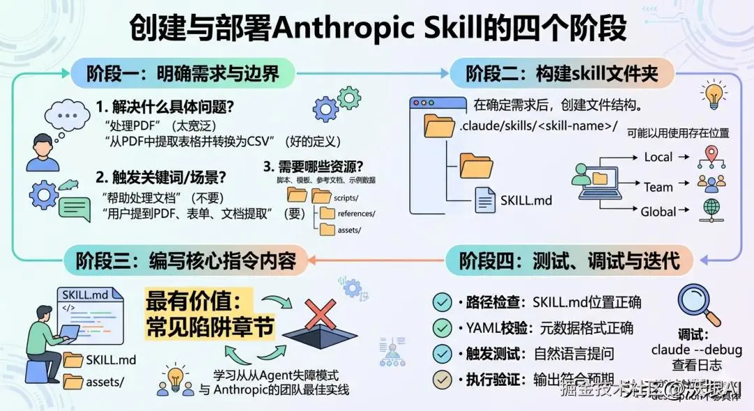 根据Anthropic官方文档和社区实践,创建并部署一个skill通常包含四个阶段。