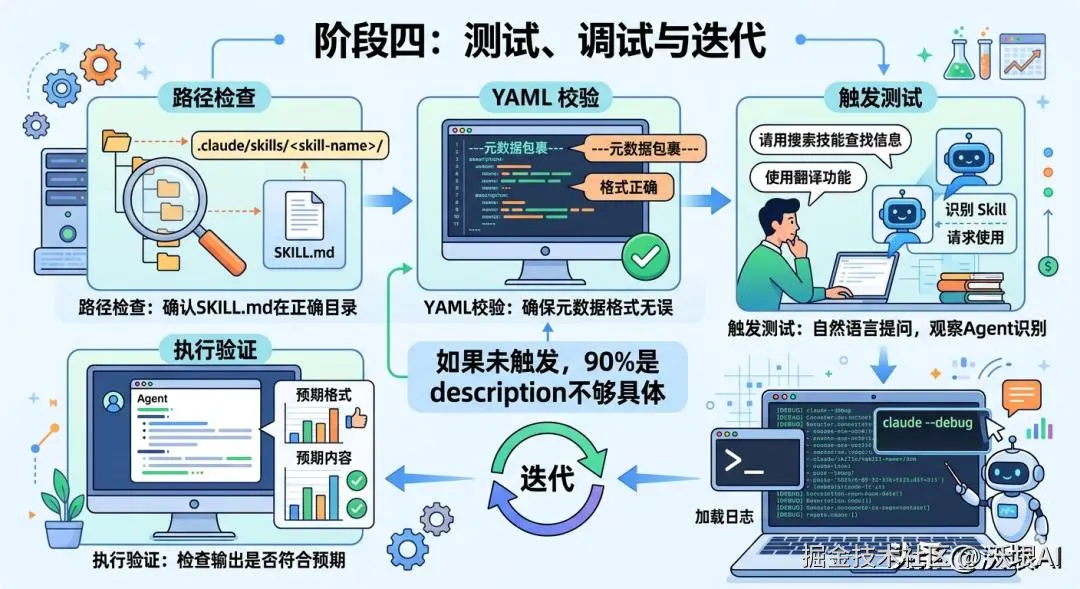 如果skill未被触发,90%的情况是description写得不够具体。调试时可运行claude --debug查看详细加载日志。