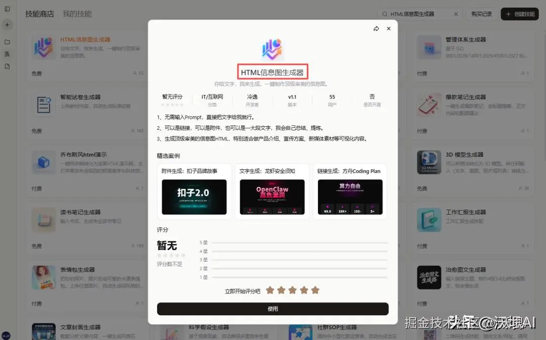 这个skill,我已免费放在了扣子技能商店,输关键词「HTML信息图生成器」查找,可以直接调用。