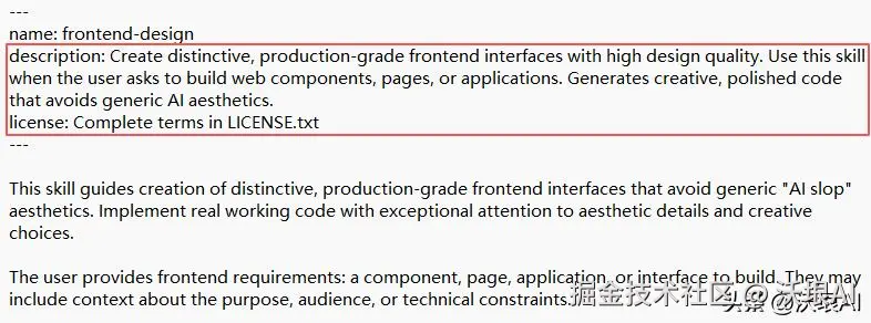 然后是description(描述),这是skill的YAML元数据非常重要的一环。其质量决定了该skill能否被Claude Code准确触发。 比如,Anthropic官方的frontend-design skill,它的description字段内容如下。
