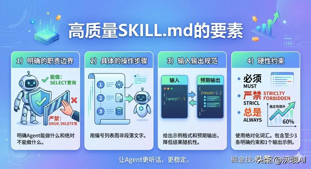 4)硬性约束:使用"必须""严禁""总是"等绝对化词汇。研究发现,包含至少3条明确约束和1个输出示例的skill,其结果的稳定性可提升60%。