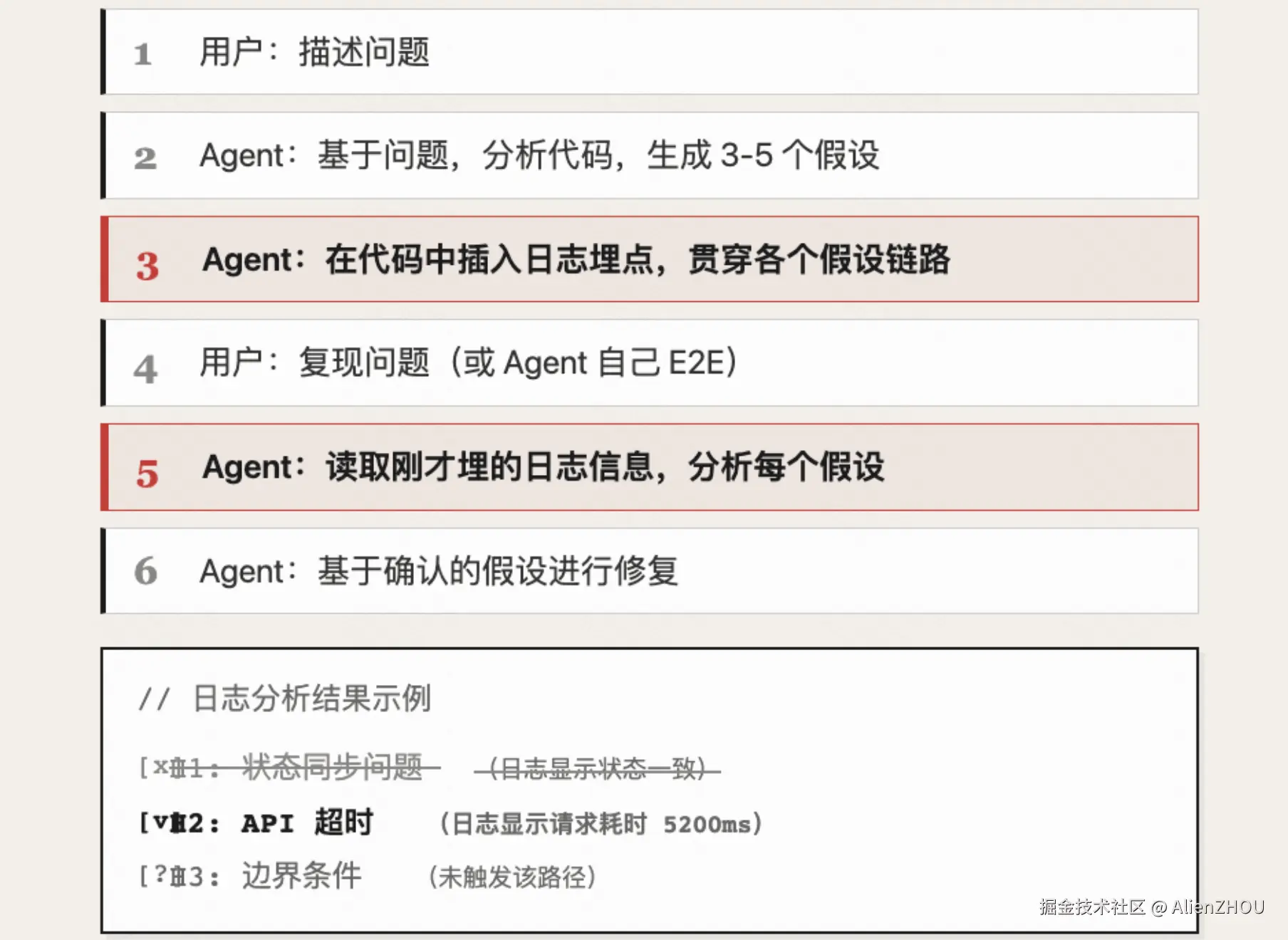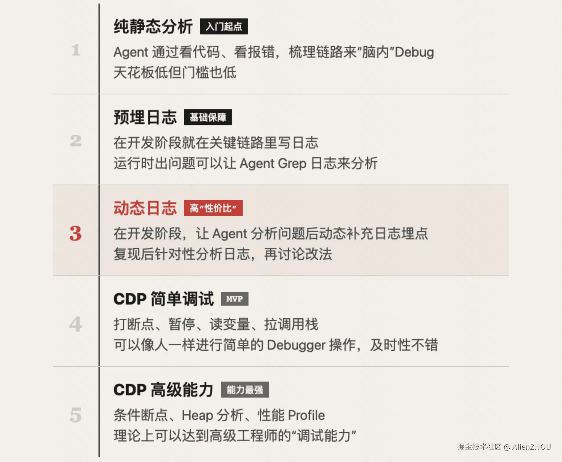 L3:动态日志:出现问题后,让 Agent 分析代码、生成假设,然后在关键路径插入日志埋点。复现后读取日志验证假设,基于确认的假设进行修复。这是当前实践的「性价比」选择------不需要前期规划,又能获得运行时信息。