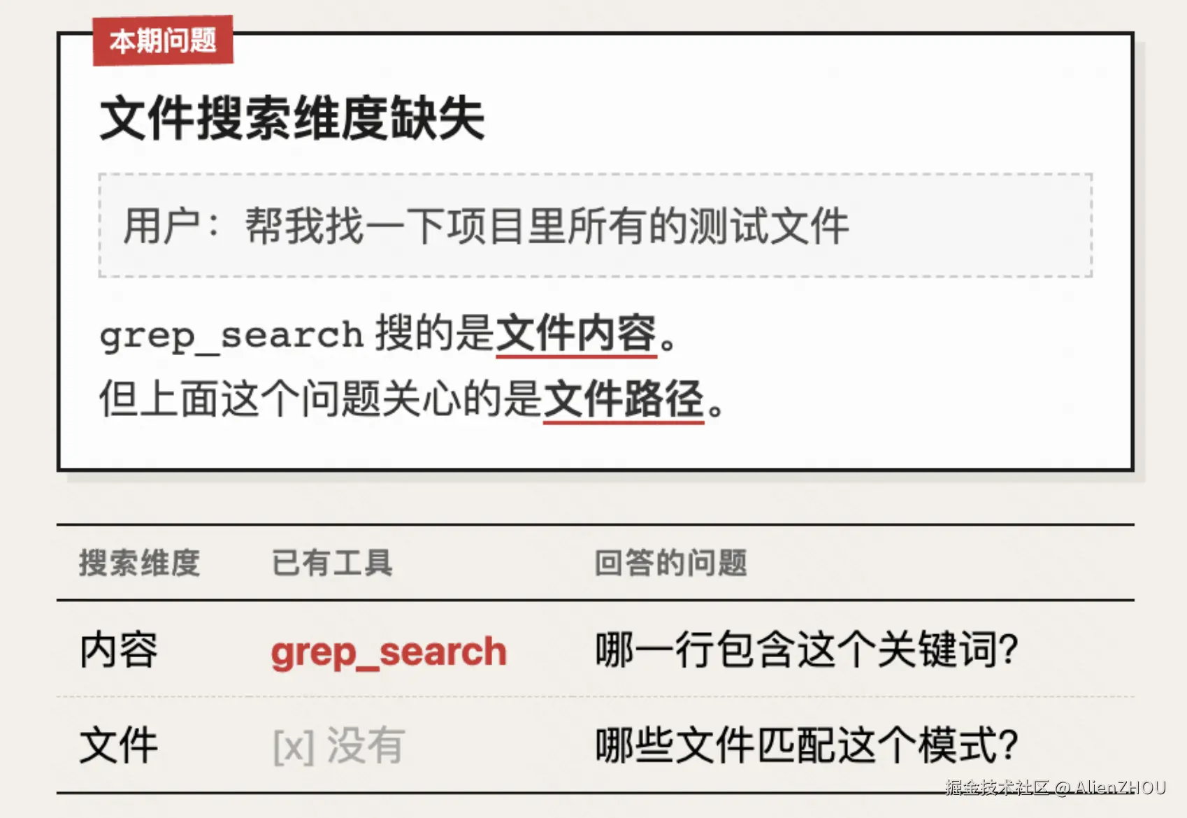 用户问「帮我找一下项目里所有的测试文件」时,他关心的是文件名匹配 *.test.ts,而不是文件内容里出现了什么字符串。这个维度的缺失,会让 Agent 在回答文件定位类问题时束手无策。