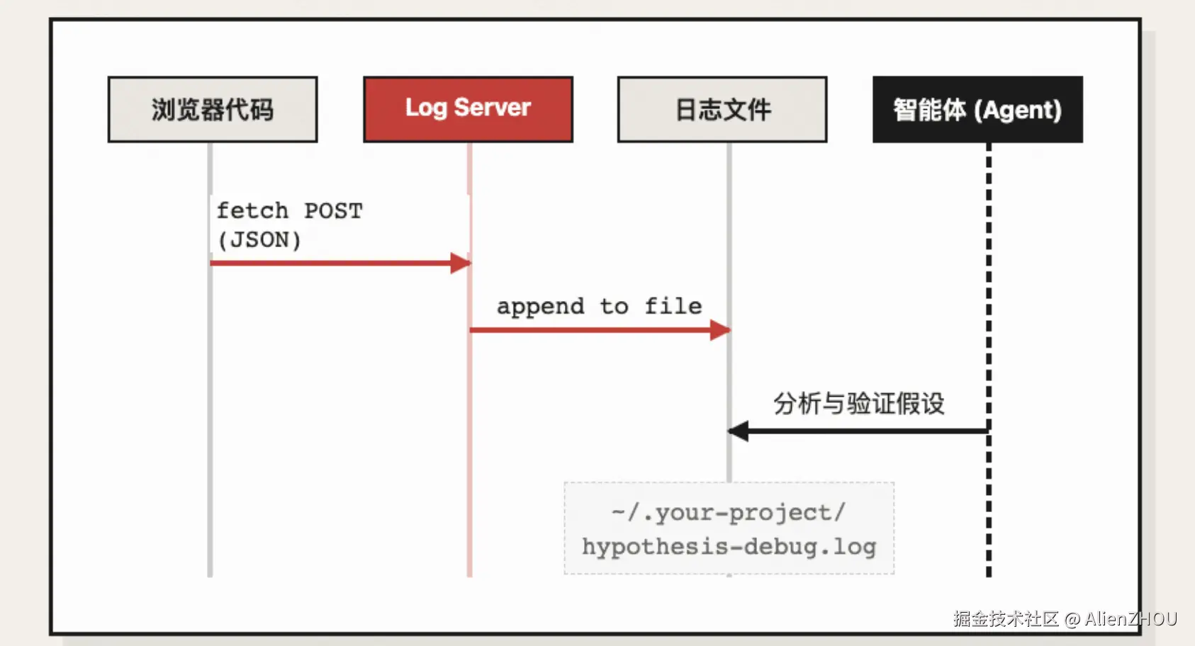 1/2层几乎每个项目都可以做,养成让 Agent 加日志、出问题让 Agent 看日志的习惯,对于调用链路较长的问题,Debug 效果有明显提升。假设验证 + 动态日志,是非常有效的 Agent Debug 方案,工作原理如下: