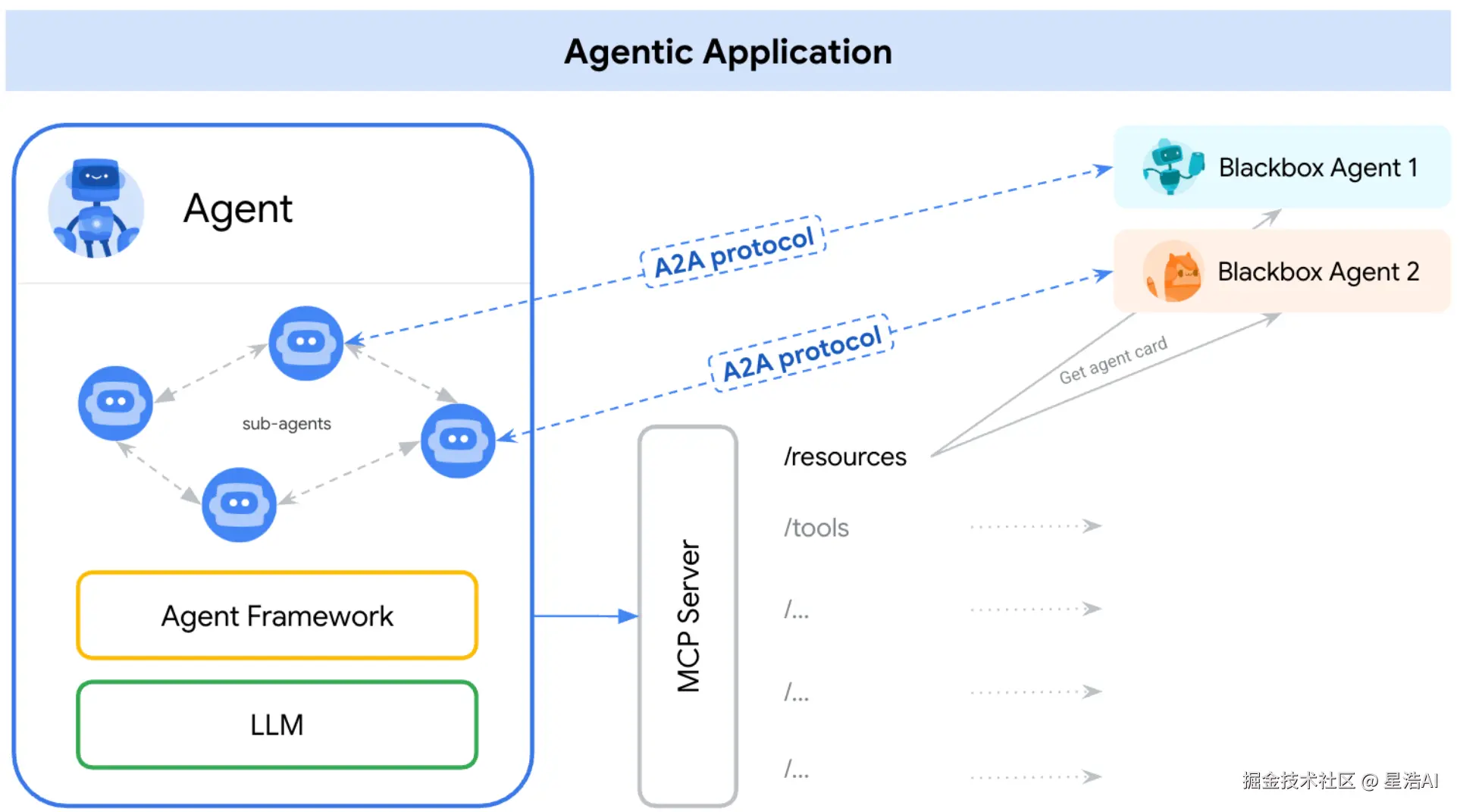 Google 建议将 A2A 智能体通过 Agent Card 描述并注册为 MCP 资源。这样框架既能通过 MCP 调用工具,又能通过 A2A 与用户、远程智能体通信,实现无缝协作。