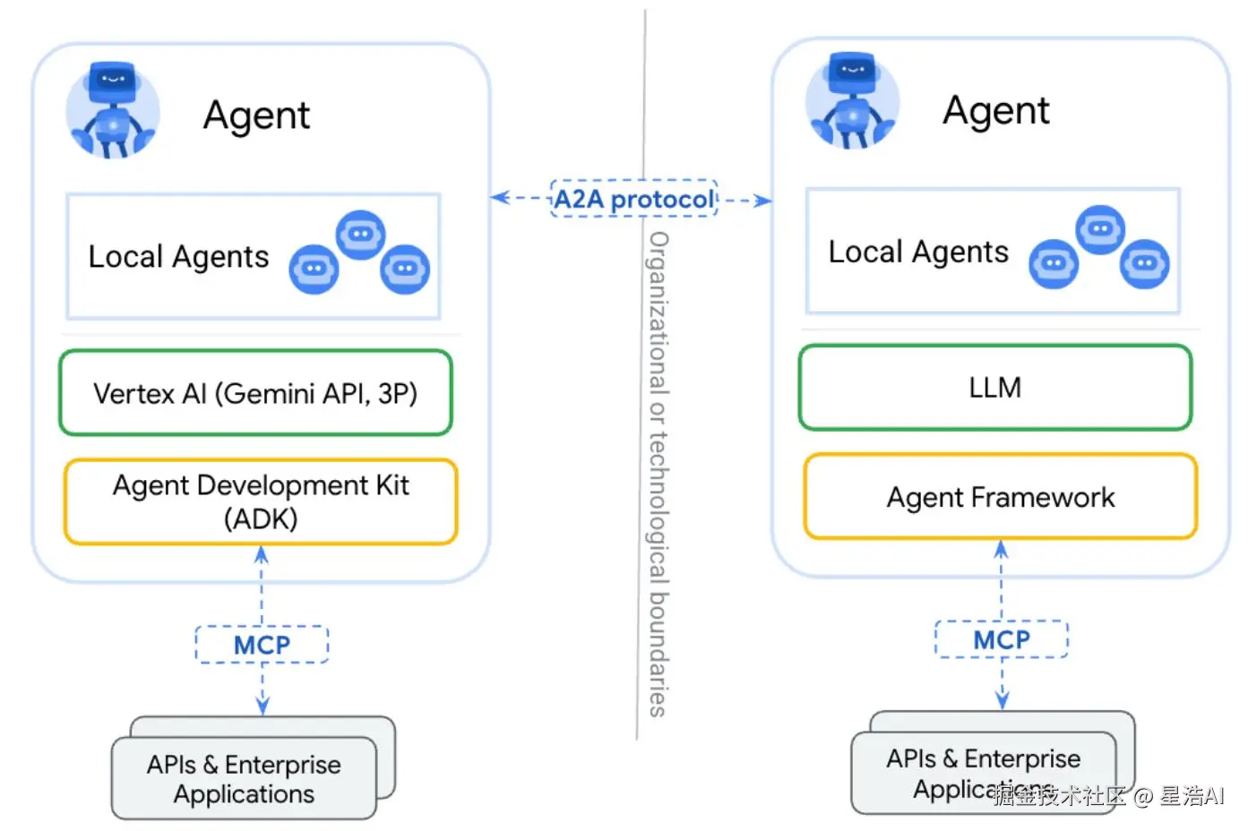 MCP 可集成传统工具(数据库、API);A2A 可对接人类用户或其他异构智能体。