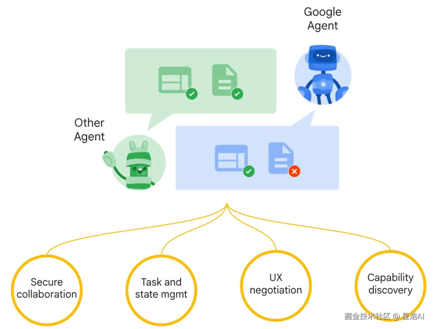 在不同 Agent 间实现动态、多模态通信,而无需共享内存、资源和工具。这是社区驱动的开放标准。
