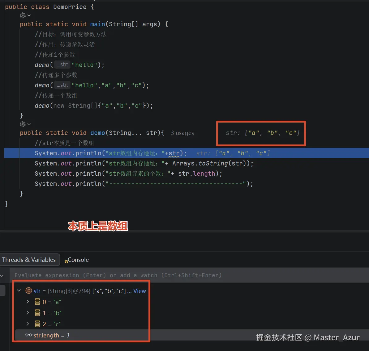 javapublic static void main(String[] args) { //目标:调用可变参数方法 //作用:传递参数灵活 //传递1个参数 demo("hello"); //传递多个参数 demo("hello","a","b","c"); //传递一个数组 demo(new String[]{"a","b","c"}); } public static void demo(String... str){ //str本质是一个数组 System.out.println("str数组内存地址:"+str); System.out.println("str数组内存地址:"+ Arrays.toString(str)); System.out.println("str数组元素的个数:"+ str.length); System.out.println("------------------------------------"); } // public static void demo2(String... str,Integer abc){ //错误,可变参数必须放到参数列表最后 // //str本质一个数组 // System.out.println(Arrays.toString(str)); // System.out.println(str.length); // System.out.println("----------------------"); // } // public static void demo2(String... str,Integer... abc){ //错误,可变参数最多只有一个 // //str本质一个数组 // System.out.println(Arrays.toString(str)); // System.out.println(str.length); // System.out.println("----------------------"); // } -