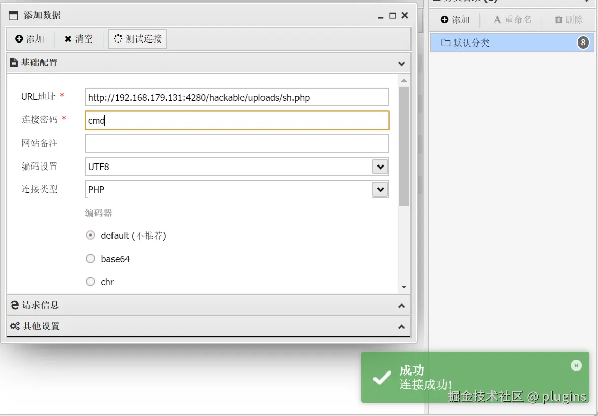 蚁剑连接 http://192.168.179.131:4280/hackable/uploads/sh.php