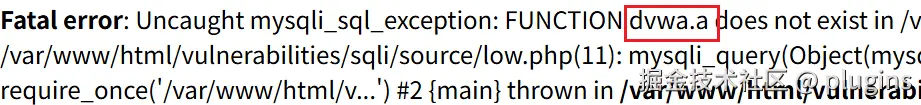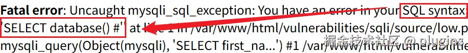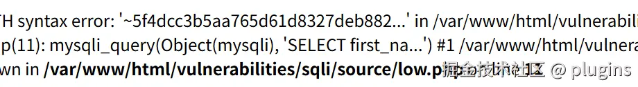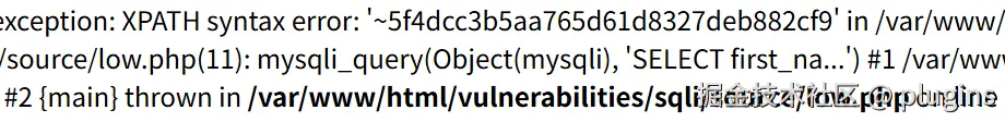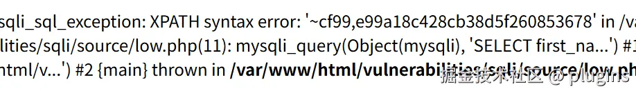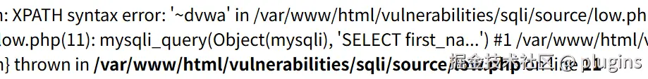数据库引擎会尝试执行extractvalue(1, '~dvwa')。由于第一个参数1不是合法XML,更重要的是,~dvwa作为一个XPath表达式是无效的语法 (~是非法字符,hex编码为 0x7e ),这会导致extractvalue()函数执行出错。MySQL在报告这个XPath语法错误时,会将出错的XPath字符串(即concat函数的结果)包含在错误信息中一并返回。