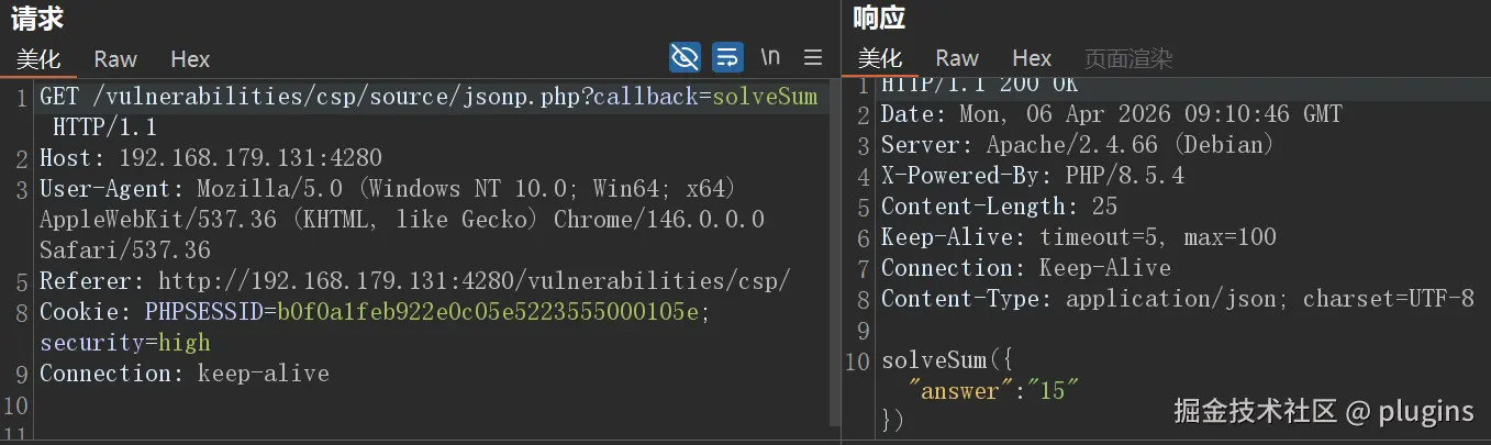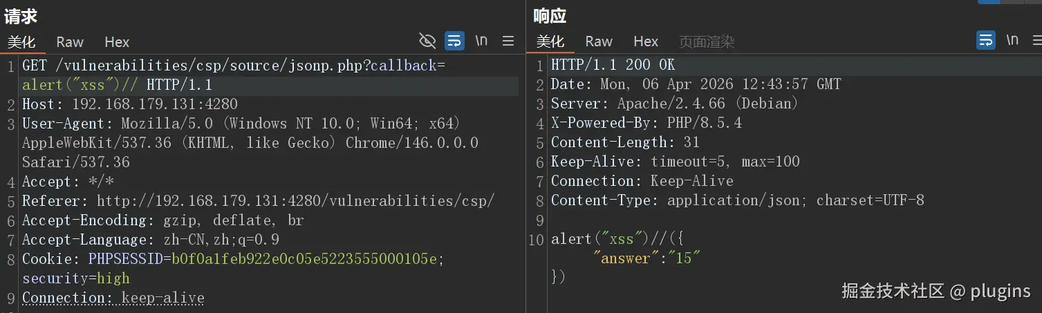 但是发现使用jsonp.php,调用方法为solveSum,根据响应格式,为JSONP响应格式,调用方法为js方法,可以将方法修改为alert("xss")//